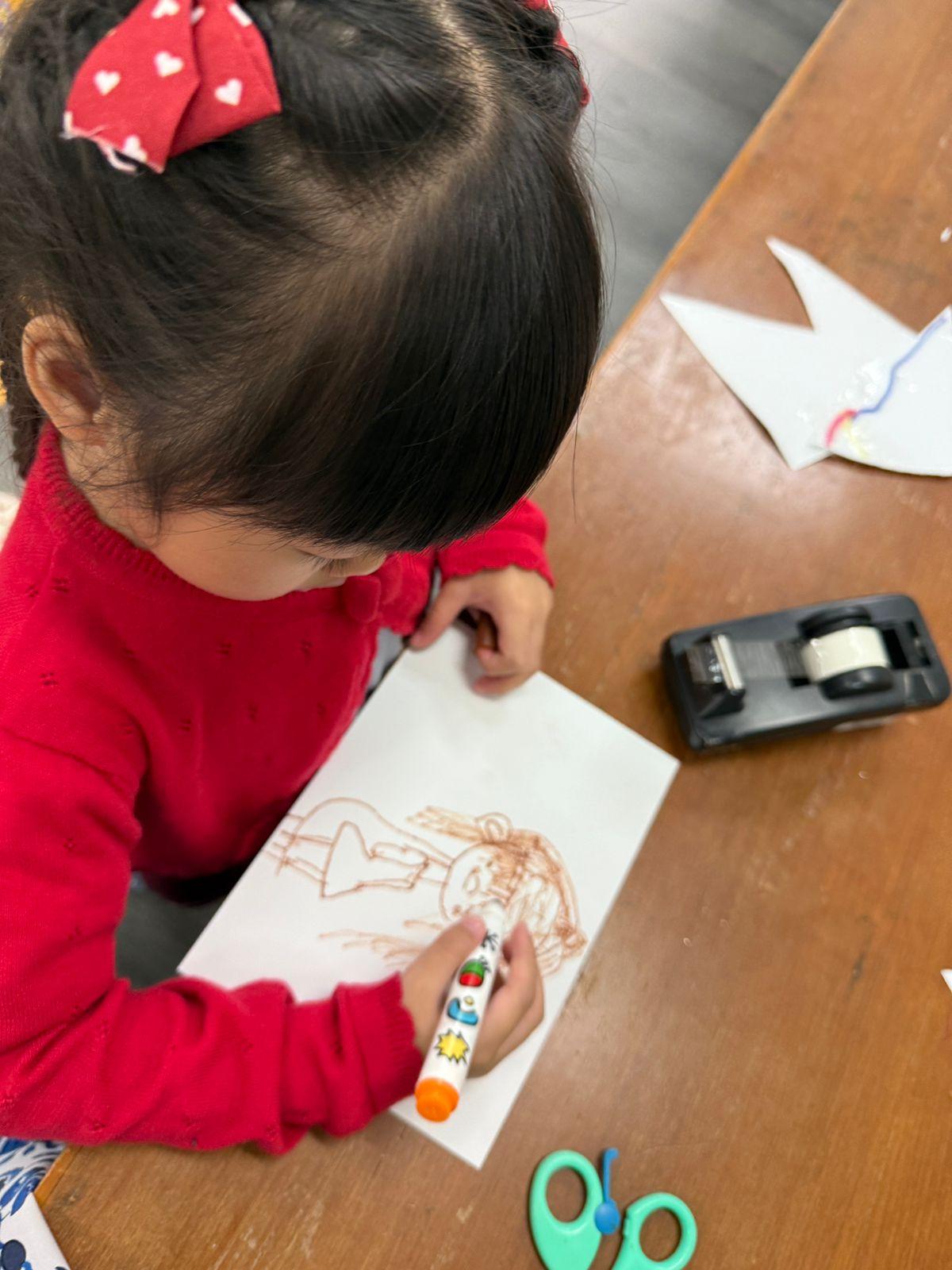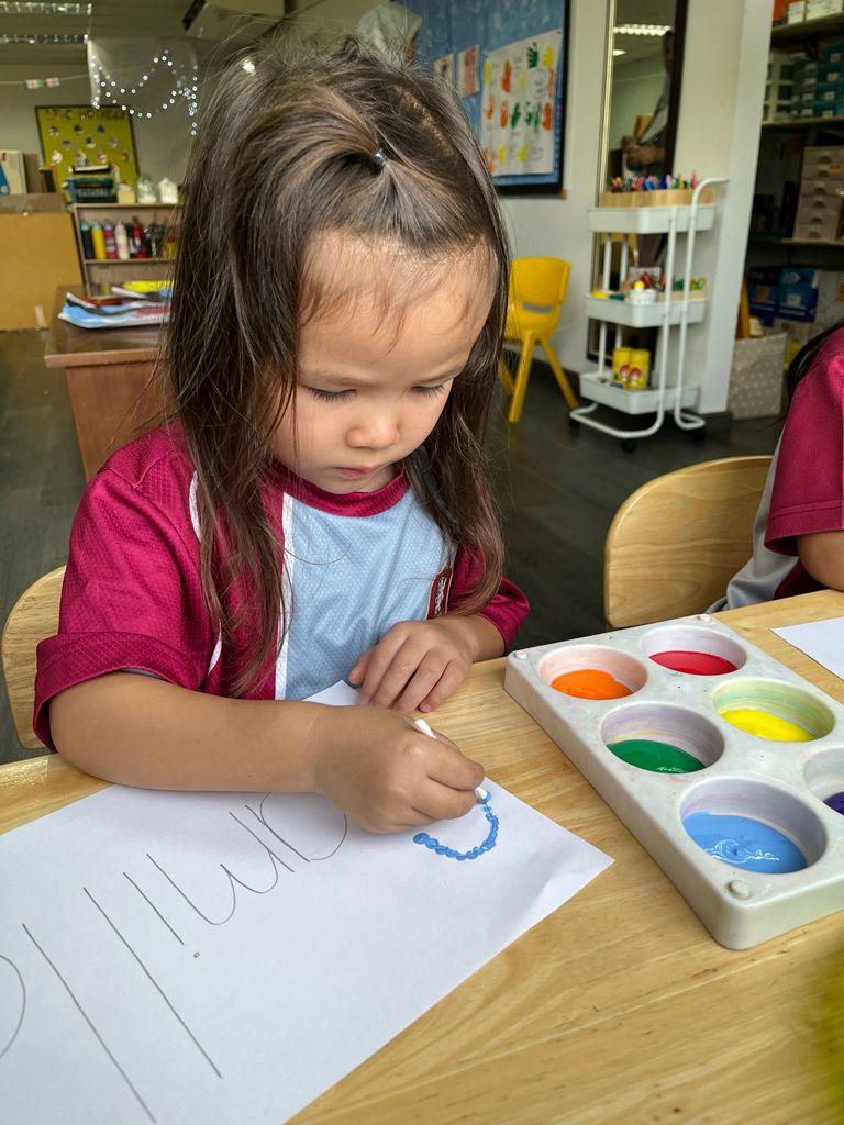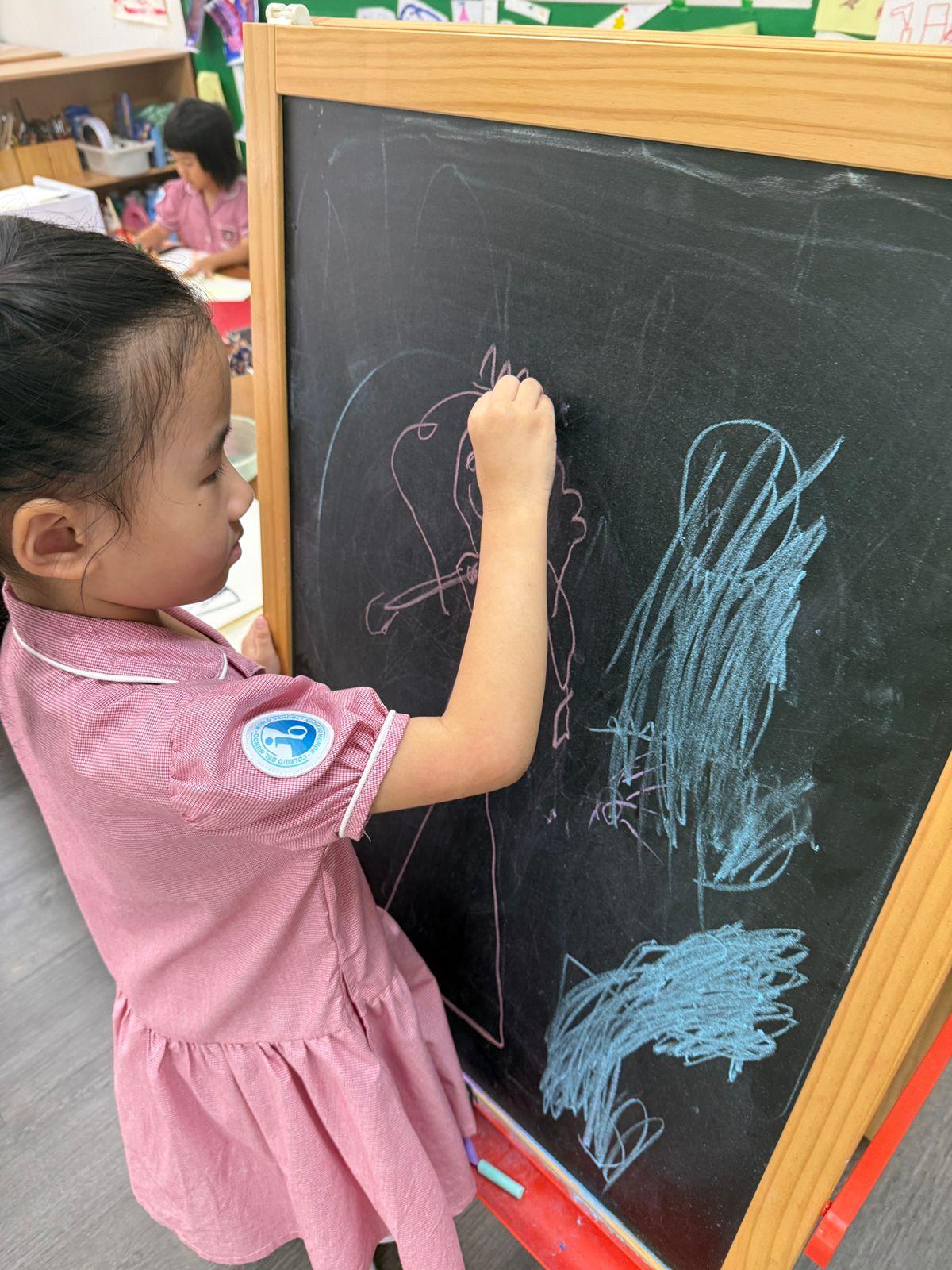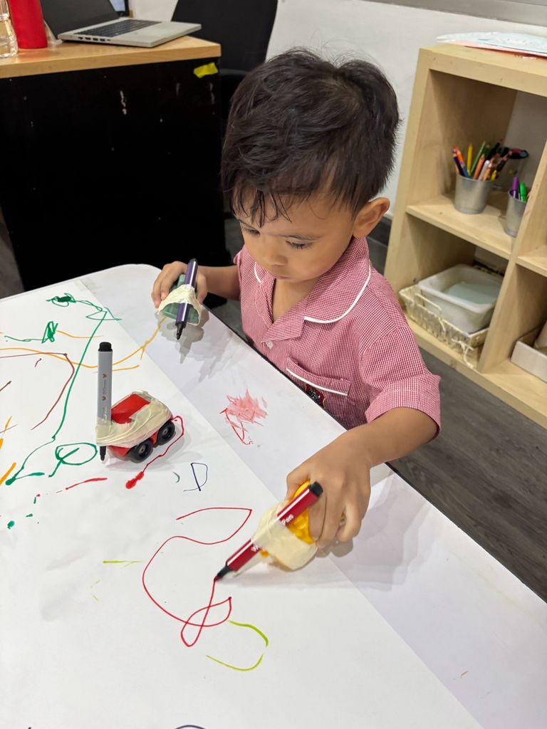 By working on these skills in a playful environment, children also grow in social and emotional ways. They share their marks with friends, talk about their drawings, and reflect on what they created. This supports our vision of raising learners who are principled, reflective, and world-ready.