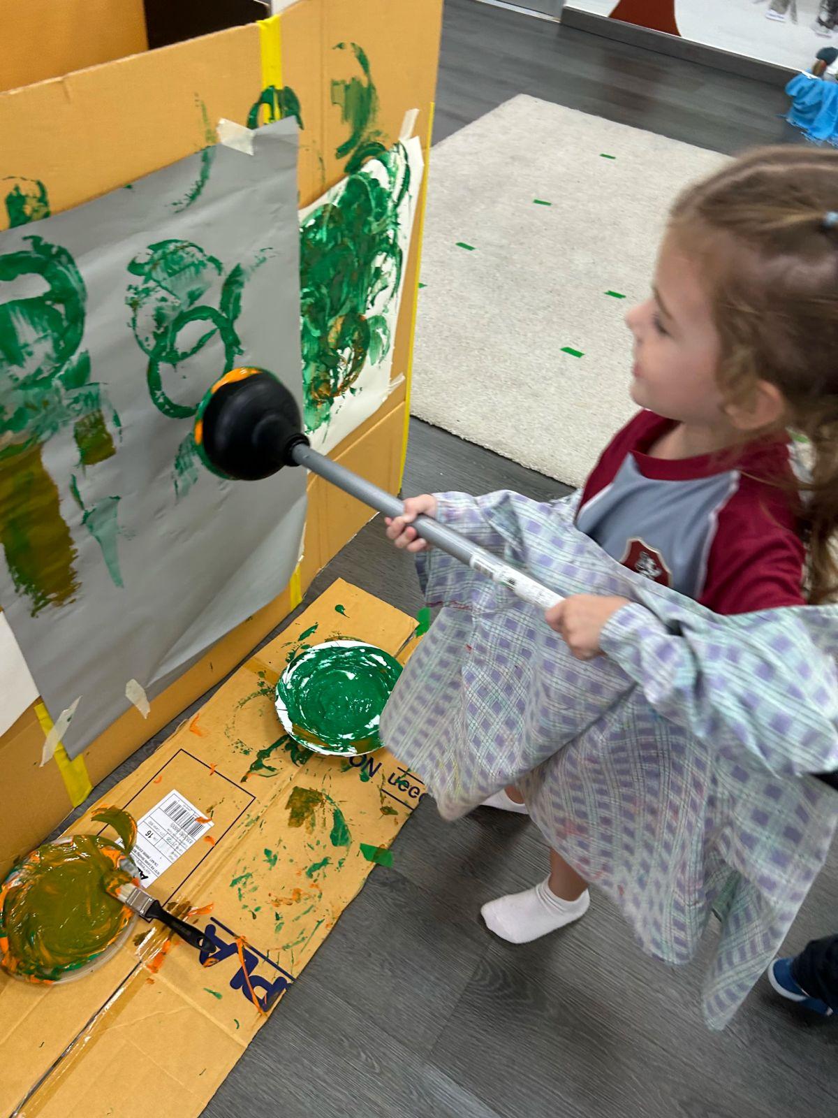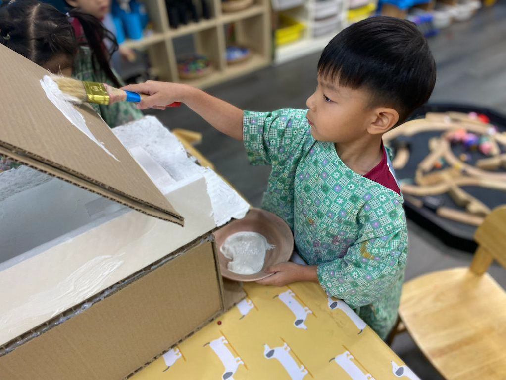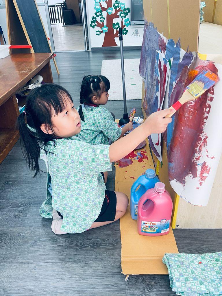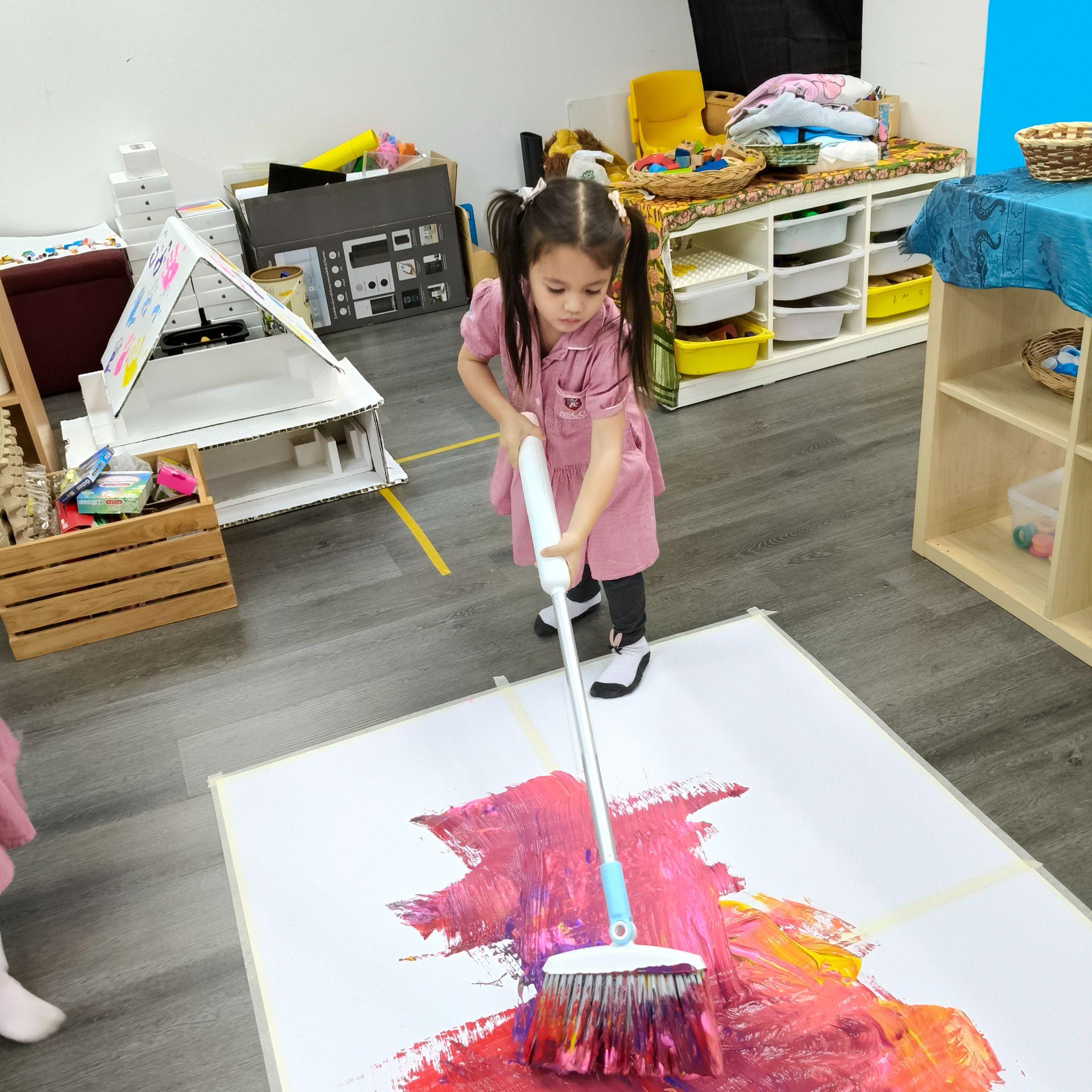 This stage builds handedness and prepares children for fine motor control. Roller painting, hand painting, and using foam or rice are part of the play.